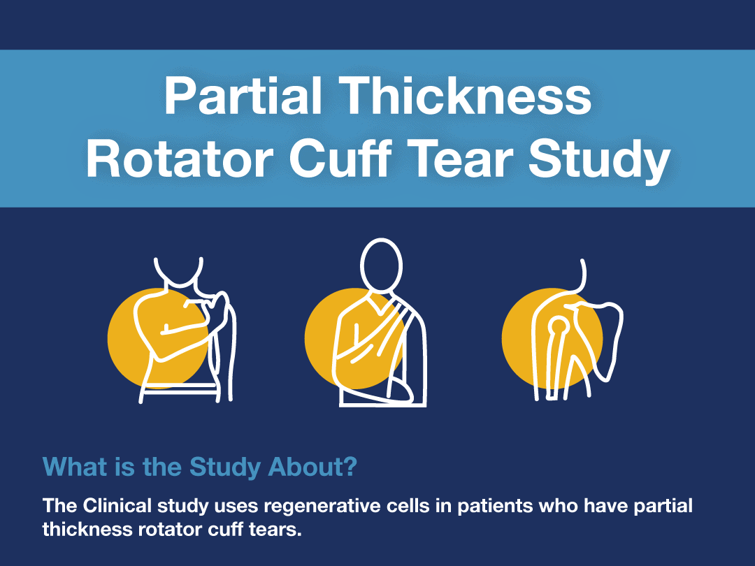 Male and female patients between 30 and 75 years old who both demonstrate clinical symptoms of a partial-thickness rotator cuff tear and who are diagnosed with partial-thickness rotator cuff tears by an MRI are eligible to participate in the trial. The study team will review with you a detailed list of criteria that’s necessary to be included in the study and discuss your eligibility.